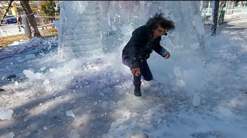 Erzincan’da 13 metrelik piramidal enstalasyonunu buz tutturarak performans denemesi yapan profesör, buz kütlesinin üzerine düşmesi sonucu ölümden döndü. Buz kütlesinin profesörün üzerine düşme anı anbean kameraya yansıdı.