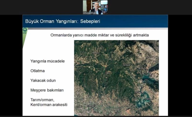 Etkinlikte konuşan Karadeniz Teknik Üniversitesi Orman Mühendisliği Bölümü Öğretim Üyesi Prof. Dr. Ertuğrul Bilgili, bu yıl yaşanan mega yangınların en önemli sebebinin "olağan dışı hava koşulları nedeniyle kuruyan orman zeminindeki yanıcı maddeler ve yüksek hızlı rüzgar" olduğunu bildirdi.