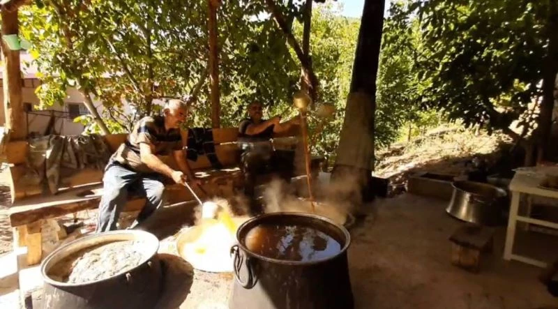 Feke’ye bağlı Gedikli Mahallesi’nde geleneksel yöntemle imece usulü üzüm hasadını yapan Nihat Gök (65) ve ailesi pekmez yapmak için kazanları kaynatmaya başladı. Bu yıl kilosu 50-70 TL arasında alıcı bulan pekmezin kışın köylülerin vazgeçilmezi olduğunu aktaran Nihat Gök, pekmezi geleneksel yöntemlerle hazırladıklarını kaydetti. Üzümün pekmez yolculuğunun meşakkatli bir mesaisi olduğunu söyleyen Gök, “Bu yıl da bağ bozumunu gerçekleştirdik. Üzümlerimiz toplandı ve üzümün önce suyunu çuvallarda ezerek çıkardık. Ardından külle yoğun ateşte içindeki zararlı maddelerin çıkması için kaynattık. Şimdi de yeniden kazanlara alarak pekmez olması için 6 saat süren ateş başında kaynatıyoruz. Pekmez bizim için kış aylarında şifadır” dedi.