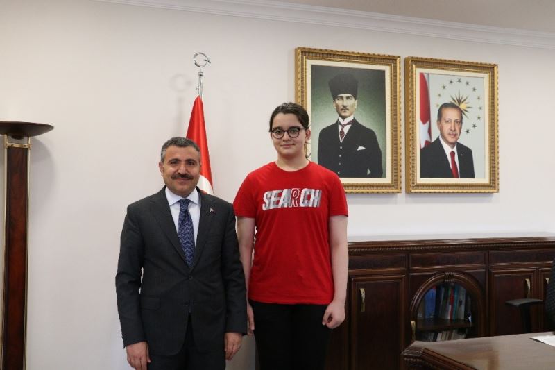 Valisi Cevdet Atay Türkiye birincisi olarak Düzce’ye büyük bir gurur yaşatan Alperen Ün ve ailesini Milli Eğitim Müdürü Murat Yiğit, Okul Müdürü Muhsin Celep ile birlikte makamında kabul ederek, tebrik etti ve başarısından dolayı ödüllendirdi.