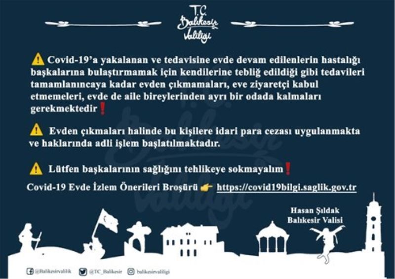 Balıkesir Valisi Hasan Şıldak test sonuçları pozitif çıkan ve karantinada olması gereken hastaları uyardı. Covid-19 hastalarının evlerinden çıkmamasını isteyen Vali Şıldak hastaların dışarıya çıkmaları halinde idari para cezası uygulanacağını ve haklarında adli işlem yapılacağını açıkladı.