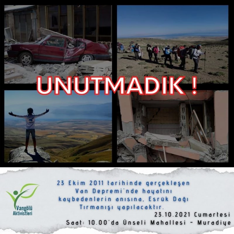 Van Gölü Aktivistleri Derneği, 2011 yılında Erciş ve Van depremlerinde hayatını kaybedenlerin anısına Esrük Dağı’na tırmanış gerçekleştirecek.