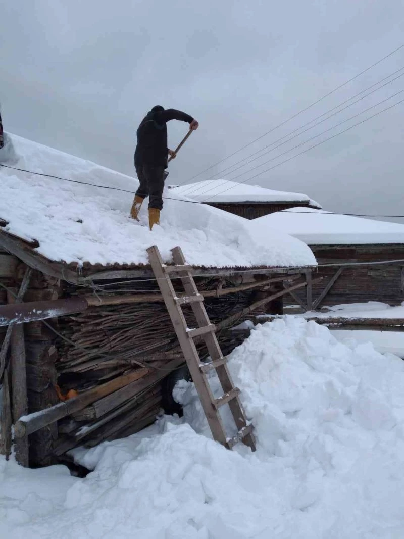 Kastamonu’nun Daday ilçesinde yaşayan köylüler, kar yağışının durmasıyla ellerine kürekler alarak çatılarda biriken karları temizlemeye başladı.