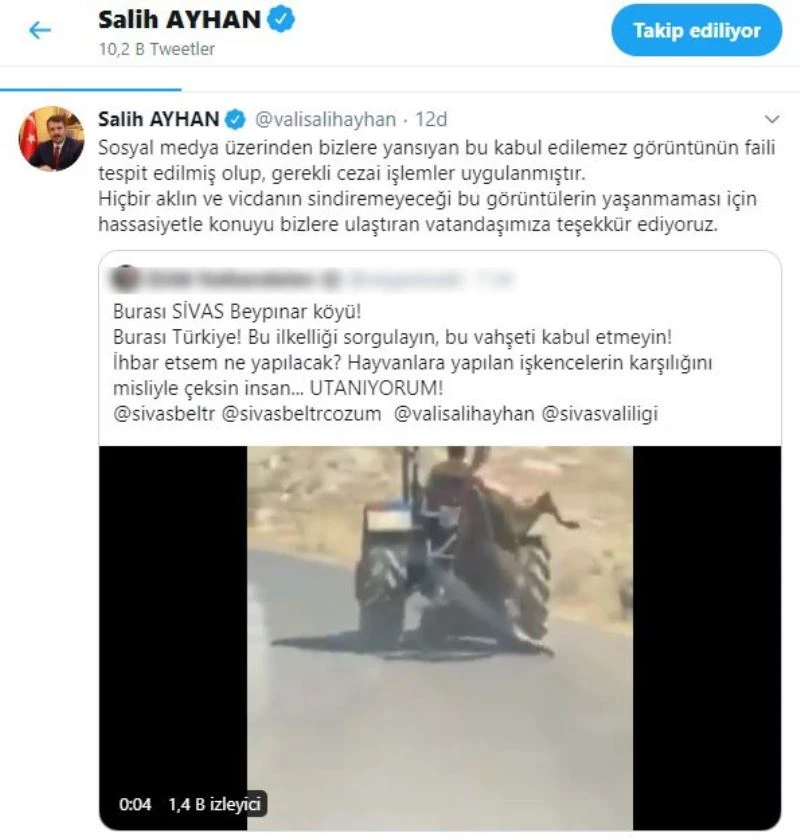 Görüntünün sosyal medyada paylaşılmasının ardından kısa bir süre geçmişti ki Sivas Valisi Salih Ayhan bir paylaşımda bulunarak, söz konusu şahsın bulunup cezalandırıldığını duyurdu. Ayhan, paylaşımında şu ifadelere yer verdi: