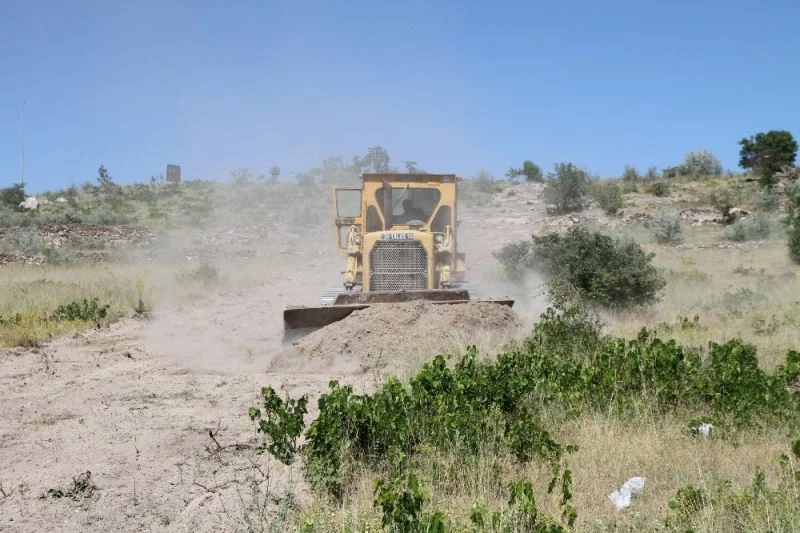 Kayalık ve engebeli alanda zorlu arazi yapısına rağmen dozer ve çeşitli iş makinalarıyla yapılan çalışmalar bütün hızıyla sürüyor.
