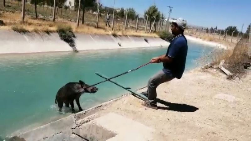 Adıyaman’ın Samsat ilçesinde sulama kanalına düşen yaban domuzunu kurtarmak için vatandaşlar "gel" diye çağırdı. Suda yüzen yaban domuzu güçlükle çıkartıldı.