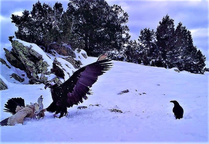 DENİZLİ – Denizli’de ağır kış şartlarından etkilenmemeleri için Doğa Koruma ve Milli Parklar 5. Bölge Müdürlüğü tarafından doğaya bırakılan yemlere ulaşmaya çalışan akbaba, kızıl geyik ve kuzgunun telaşı, fotokapanlara yansıdı.