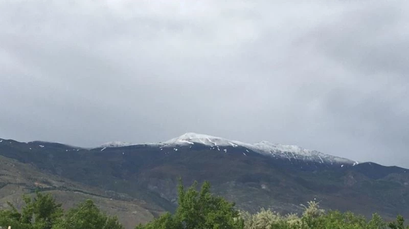 Erzincan’da dün sağanakla birlikte yağan dolu, 3 bin 549 metre yüksekliğindeki Esence Dağı’nın zirvesini beyaza bürüdü.
