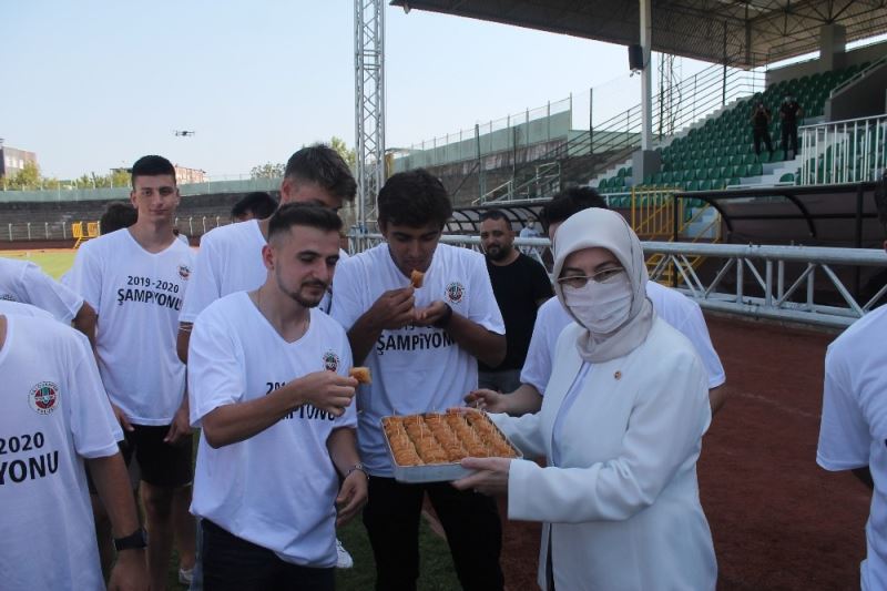 Milletvekili Meliha Akyol ve Belediye Başkan Vekili Mustafa Tutuk, teknik heyet ve futbolculara baklava ikramında bulunarak TFF 2. Ligine yükselme sözü aldı.
