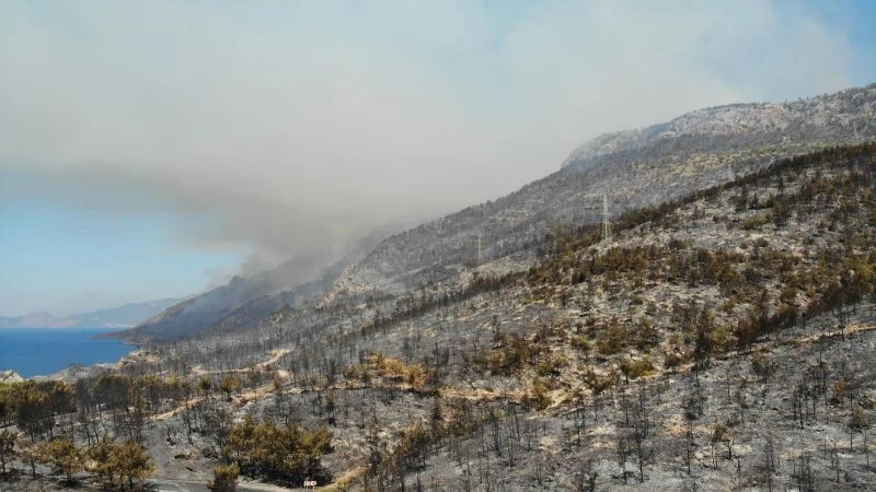 Yangının acı yüzü gün ağarınca ortaya çıktı. Yanan bölgeler drone ile havadan görüntülenirken, 3 gün önce yemyeşil alanlar siyaha büründü. İlçe merkezi ile sahil kesiminde bulunan ormanlık alanların büyük bir kısmı yanarken, bazı bölgelerden duman çıktığı görüldü.