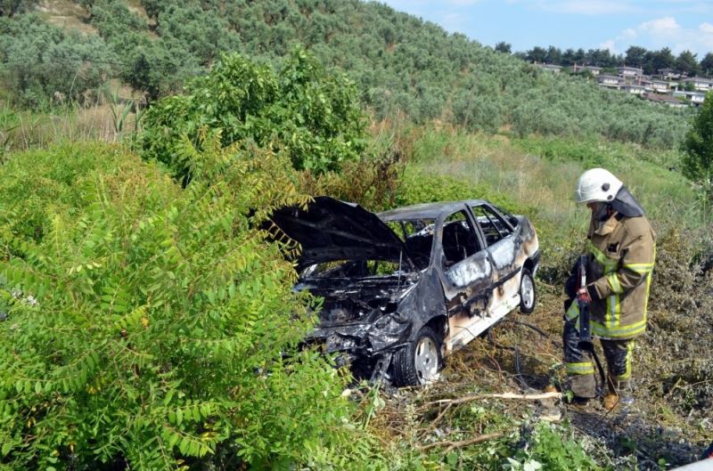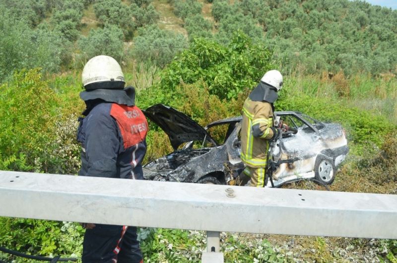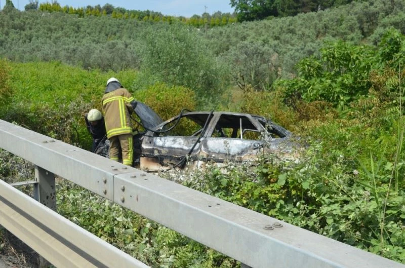 Bursa Mudanya Yolu üzerinde önündeki otomobile çarpması sonucu direksiyon hakimiyetini kaybeden sürücü, bariyerleri aşarak otluk alana yuvarlandı. Otomobilde çıkan yangın sonrası, yaralı sürücüsü çarptığı aracın sürücü tarafından çıkarılarak yanmaktan son anda kurtarıldı.