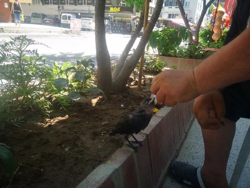 İzmir’in Dikili ilçesinde, ağaçtaki yuvasından düşen ve yaralanan yavru karga bir esnaf tarafından sahiplenildi.