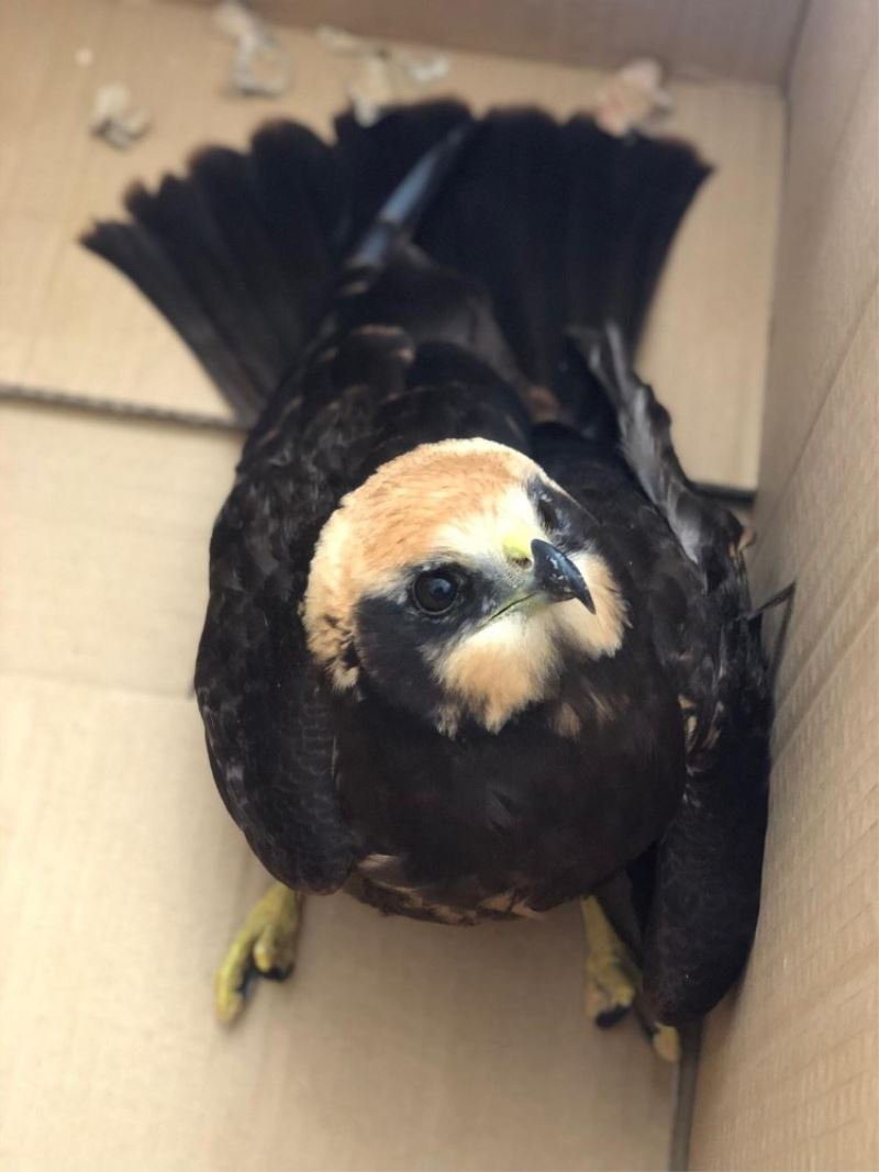 Erdek İlçe Jandarma Komutanlığı ekipleri tarafından, devriye görevi sırasında Erdek İlçesi Aşağıyapıcı-Tatlısu Mahalleleri yol ayrımında yol kenarında doğada nadir olarak görünen yırtıcı kuşlar arasında yer alan yaralanmış “Saz Delicesi ” türü kuş buldu.