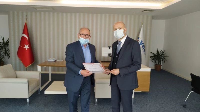 Türk Kızılay’ı Şube Başkanı Ahmet Ali Bulut, YEDAŞ Genel Müdürü Hasan Yasir Bora’ya destek ve katkılarından dolayı teşekkür belgesi takdim etti.
