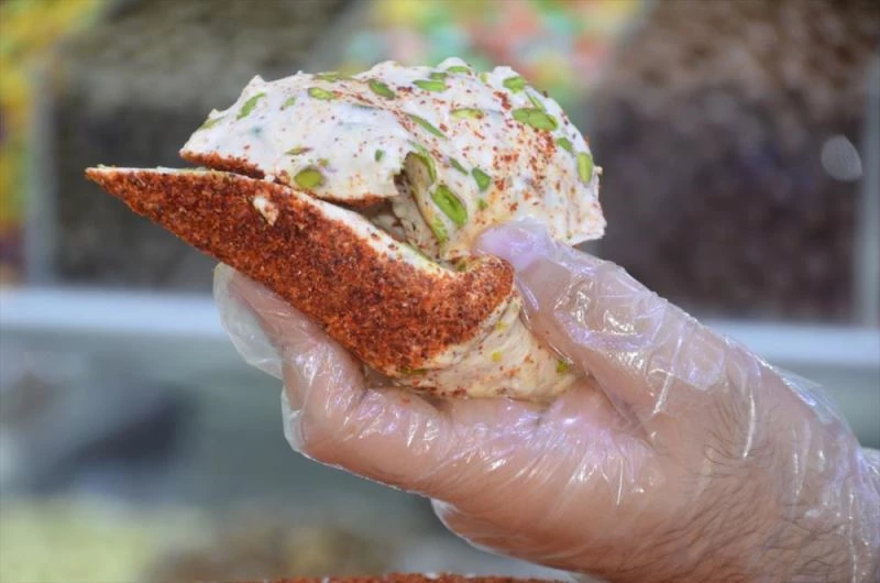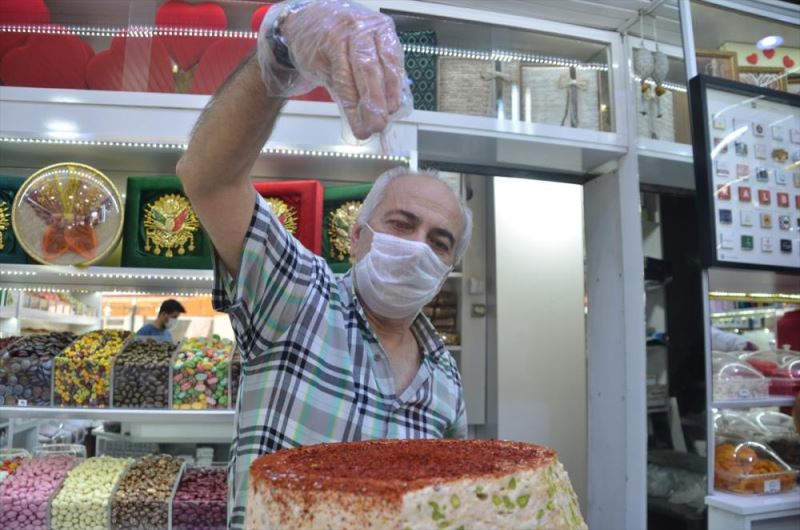 KAHRAMANMARAS (AA) - ÖMER FARUK SALMAN - Kahramanmaras'ta yarim asirdir lokum ve sekerleme üretimi yapan Ökkes Nagas, pul biberle ürettigi fistikli lokumu müsterilerinin begenisine sundu.