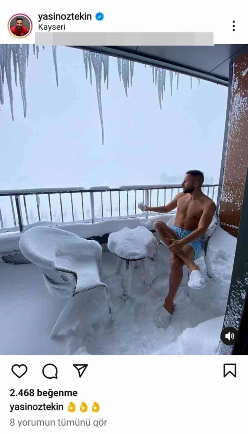 Samsunspor’un deneyimli futbolcusu Yasin Öztekin, verilen 3 günlük izni Kayseri’de değerlendirdi. Karla kaplı otelin balkonuna sadece şort ve terlikle oturan Yasin Öztekin’in paylaşımı kısa sürede binlerce beğeni aldı. Fit ve kaslı görüntüsüyle dikkat çeken Öztekin’in fotoğrafının altına yerli ve yabancı hayranları “makine” ve “machine” gibi yorumlarda bulundular.