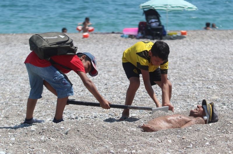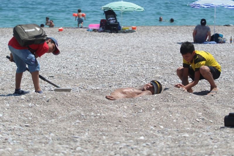 Turizm kenti Antalya’da yüksek nem ve sıcak havadan bunalanlar, dünyaca ünlü Konyaaltı Sahili’nde yoğunluk oluşturdu. 40 dereceyi bulan sıcakta yaşlı bir adam ise kendini kuma gömdü.