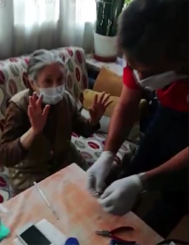 Yaşlı kadının parmağına sıkışan yüzüğü itfaiye ekipleri çıkardı