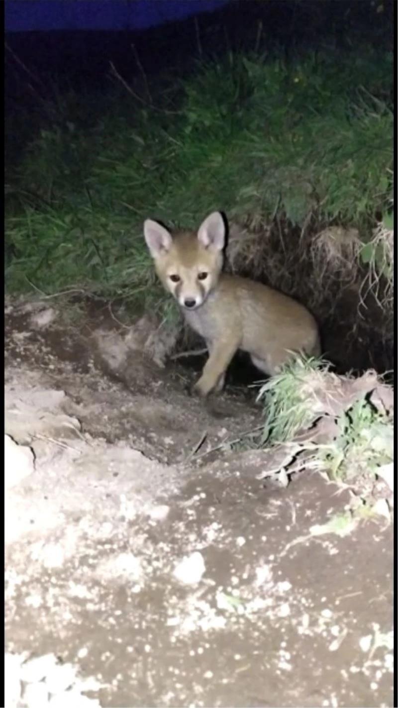 Ardahan’a yaklaşık 17 kilometre uzaklıkta bulunan Tepeler Köyünde yuva yapan tilki, yavrularının doyurmak için yiyecek aramaya gidince, yavrulardan bir tanesi kendisini yuvadan dışarı attı. Annesinin yiyecek getirmesini dışarıda, yuvalarının üzerinde bekleyen tilki yavrusu her hangi bir ses duyunca yuvaya girerek saklanıyor.