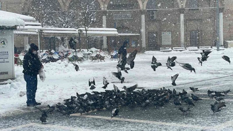 DÜZCE – Düzce’de vatandaşlar, kar yağışı sebebiyle yiyecek bulmakta zorlanan kuşlar için belediye meydanına yem bıraktı.