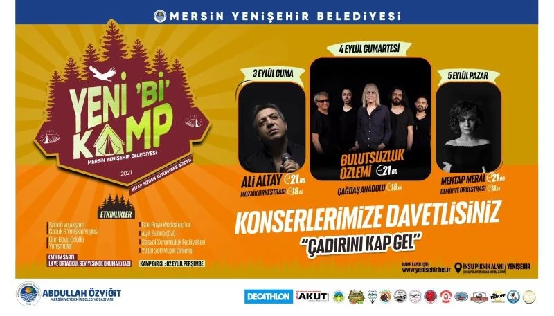 Mersin’in merkez ilçe Yenişehir Belediyesinden yapılan açıklamaya göre, Yeni ‘Bi’ Kamp etkinliği 3 gün boyunca doğaseverlere eğlenceli saatler yaşatacak. İnsu Piknik Alanında yapılacak kamp etkinliğine katılım ücretsiz olacak, ancak dileyen katılımcılar kamp girişinde ilkokul ve ortaokul seviyesinde en az bir okuma kitabını görevlilere teslim edecek. Böylelikle köylerde oluşturulacak kütüphaneler doğaseverlerin katkılarıyla zenginleşecek.