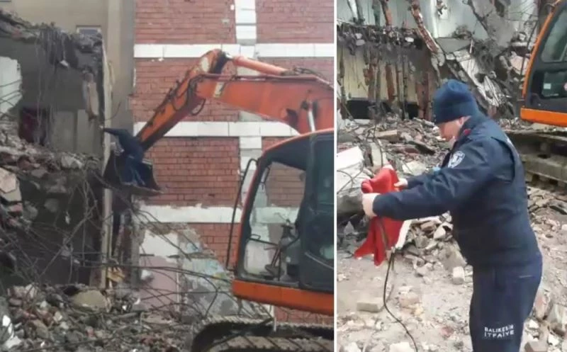 Erdek Cumhuriyet Meydanında bir binanın yıkımı esnasında duvarda asılı Atatürk’ün posterini fark eden iş makinesi operatörü ve itfaiye eri, hemen yıkımı durdurdu ve Atatürk posterini binanın içerisinden çıkarttı.
