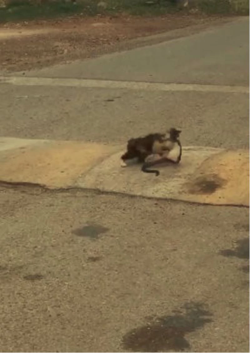Yolda bulduğu 1 metrelik yılanı ağzına alıp götüren kedi pes dedirtti