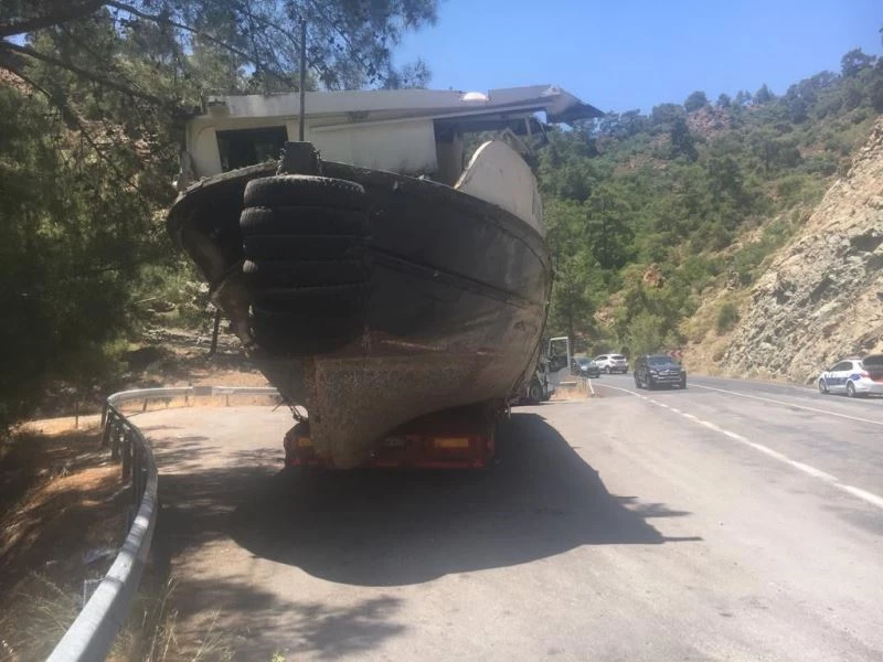 Muğla’nın Fethiye ilçesindeki tersaneden yüklediği tekneyle Göcek rampasında yaşanan trafik yoğunluğu sebebiyle yolda kalan çekici, polis ekiplerinin yardımıyla yoluna devam etti.