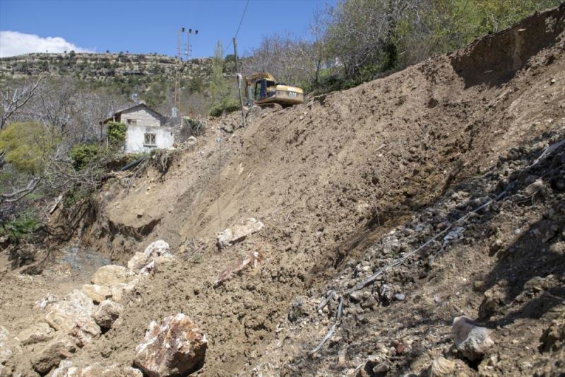 Ekiplerin çalisma yaptigi noktalardan, Mut ilçesi Kozlar Yaylasi'nda eriyen kardan dolayi göçük meydana gelen yol saglamlastiriliyor.