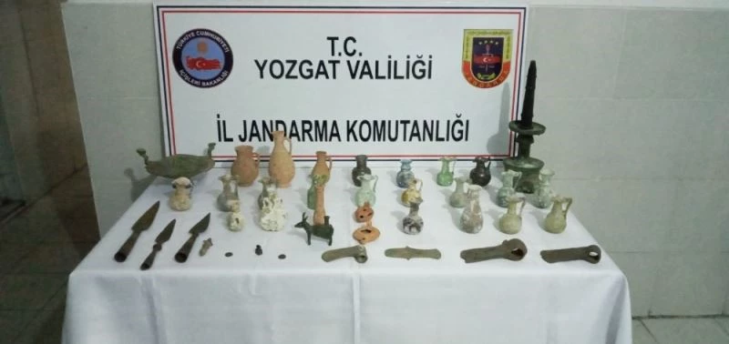 Yozgat İl Jandarma ekipleri, Akdağmadeni ilçesinde bir dinlenme tesisinde içerisinde tarihi eser olduğu ihbarını aldığı aracı durdurdu. Araç içerisinde yapılan aramada değişik dönemlere ait olduğu belirlenen 19 gözyaşı şişesi, 6 adet çömlek, 2 adet sikke, 1 mühür, 1 adet öküz heykeli, 1adet şamdan ve altlığı, 4 adet balta, 3 adet metal ok ucu ve bir adet figür olmak üzere 39 parça tarihi eseri ele geçirdi.