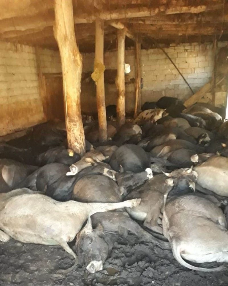 Çoban Husret Keği, “Yaklaşık 3 aydır ben bunların çobanlığı yapıyorum. Her sabah hayvanları dağa çıkartıp otlattıktan sonra akşam getirip ahıra bırakıyorum. Bu sabah hayvanları otlamak için ahıra geldiğimde baktım bütün hayvanlar telef olmuş. Ben de bilmiyorum onun sebebi nedir, neyin nesidir bilmiyorum. 50 büyükbaş hayvanımız telef oldu. Büyüklerimizden yardım bekliyoruz” dedi.