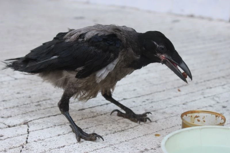 Yuvasından düşen karga esnafın ve vatandaşın ilgi odağı oldu