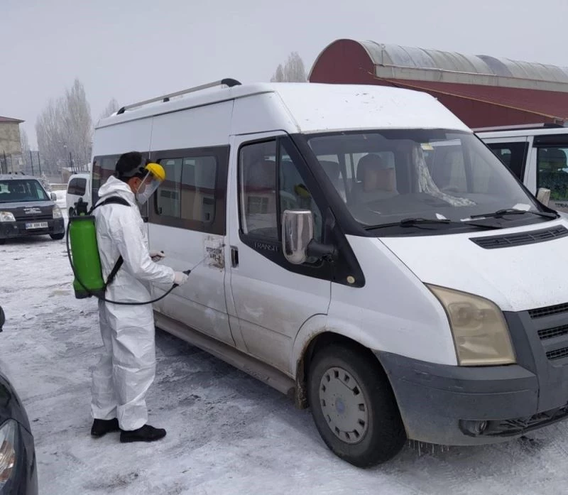 Van’ın Çaldıran Belediyesi ekipleri, pazartesi günü eğitimin yüz yüze başlayacağından dolayı kırsal mahallelerdeki okullara öğrenci taşıyacak servisleri dezenfekte etti.