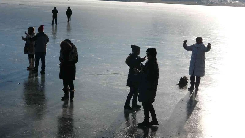 Yüzeyi buzla kaplanan Çıldır Gölü misafirlerini ağırlamaya başladı