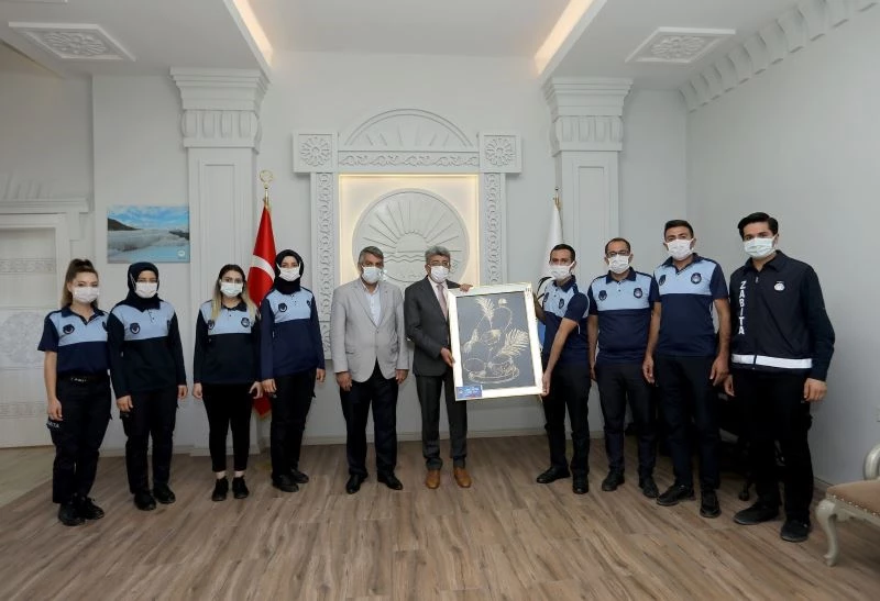 Van Büyükşehir Belediyesi Zabıta Daire Başkanlığı, “1-7 Eylül Zabıta Haftası” kapsamında kentte çeşitli etkinlikler düzenliyor. Bu kapsamda Zabıta Dairesi Başkanlığından bir heyet Vali ve Büyükşehir Belediye Başkan Vekili Mehmet Emin Bilmez’i ziyaret etti. Büyükşehir Toplantı Salonunda gerçekleştirilen ziyarette zabıta teşkilatının 195. yıl dönümünü kutlayan Vali Mehmet Emin Bilmez, kentte yapılan denetimlerle ilgili Genel Sekreter Yardımcısı Esiner Çetin ve Zabıta Dairesi Başkanı Sabahattin Ergenç’ten bilgi aldı. Bir süre zabıtalarla görüşen Vali Bilmez, ülkemizin köklü teşkilatlarından olan zabıta teşkilatının kent hayatı için büyük bir öneme sahip olduğunu belirterek, zabıta personeline çalışmalarında başarılar diledi. Vali Bilmez’e tablo hediye eden zabıtalar, buradaki ziyaretin ardından Genel Sekreter Mehmet Fatih Çelikel’i de makamında ziyaret ettiler.