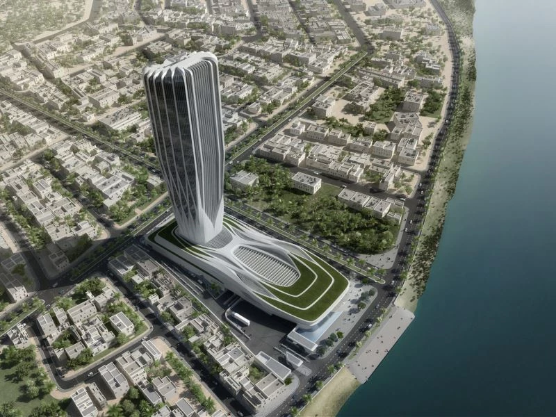 Daha yüksekteki katlardan ışığın sürekli gelmesine izin veren yapısal bir dış iskelete teğet olacak şekilde geniş orta katlardan dar zemine doğru azalan çizimin, ilk defa 2011 yılında ortaya çıkan 170 metrelik kulesi içinde kapsadığı mekânı çoğaltmak için tasarlanmış. Dicle nehrinin önemine ve ülke ticaretinin şekillenmesindeki rolüne sürekli bir referansla, banka binasının podyum seviyesi, nehirden yansıyan ışığı taklit eden, değişen dış iskeletle ışığın iç mekanlarda parıldamasına izin vererek sert ve yumuşak peyzajları birleştiriyor.