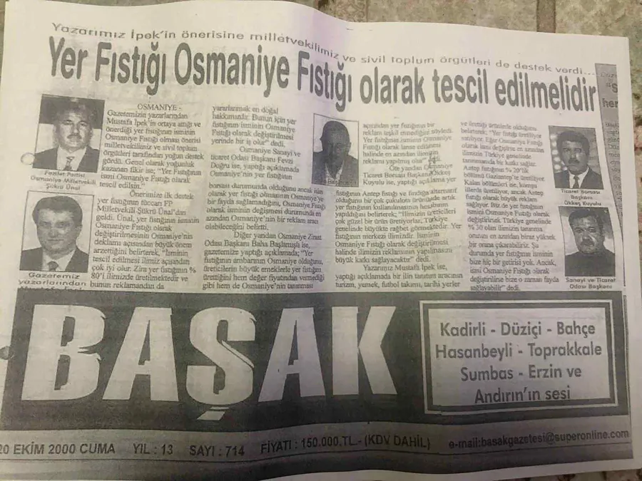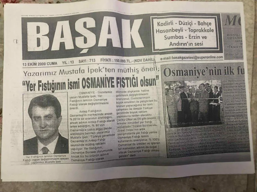 Yıl 2000, günlerden 13 Ekim Cuma. İleri görüşlülüğüne inandığım gazetemizin köşe yazarlarından Mustafa İPEK ile Kobaner Pasajı’ndaki Başak Gazetemizin bürosunda sohbet ediyorduk. Mustafa İPEK ağabeyim bana ‘’Bahri gel yer fıstığının isminin OSMANİYE FISTIĞI olarakdeğiştirilmesi ve coğrafi işaret alınması için kampanya başlatalım.’’ önerisinde bulundu. Gerçekten çok müthiş bir öneriydi.