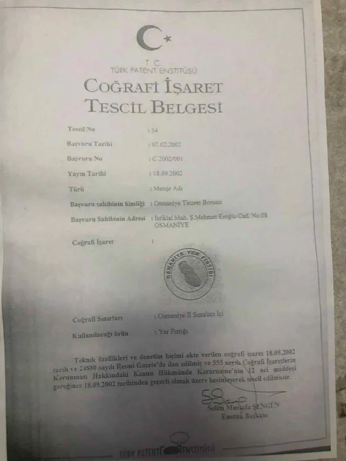 Bu toplantı sonucunda coğrafi işaretin alınması için Türk Patent Enstitüsü’ne müracaat edildi ve 18.09.2002 tarihinden geçerli olmak üzere ‘’OSMANİYE YER FISTIĞI’’ olarak tescili yapıldı.