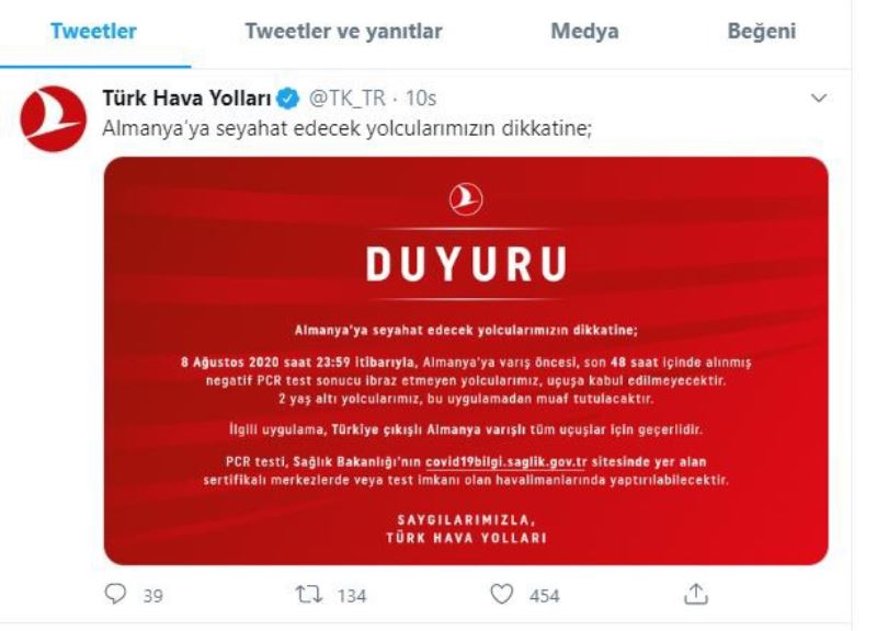 Türk Hava Yolları'nın resmi sosyal medya platformlarından konuya ilişkin yapışan paylaşımda, "Almanya'ya seyahat edecek yolcularımızın dikkatine; 8 Ağustos saat 23.59 Almanya'ya varış öncesi, son 48 saat içerisinde alınmış negatif PCR sonucu ibraz etmeyen yolcularımız, uçuşa kabul edilmeyecektir. 2 yaş altı yolcularımız, bu uygulamadan muaf tutulacaktır. İlgili uygulama, Türkiye çıkışlı Almanya varışlı tüm uçuşlar için geçerlidir. PCR testi, Sağlık Bakanlığı'nın covid19bilgi.saglik.gov.tr sitesinde yer alan sertifikalı merkezlerde veya test imkanı olan havalimanlarında yaptırılabilecektir" denildi.