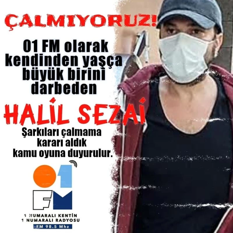 Şarkıcı Halil Sezai’nin, İstanbul Tuzla’da 67 yaşındaki bir vatandaşı darp ettiği görüntülerin ortaya çıkmasının ardından, Adana’da yayın yapan 01 FM radyo istasyonu, Halil Sezai şarkılarını boykot kararı aldıklarını duyurdu.