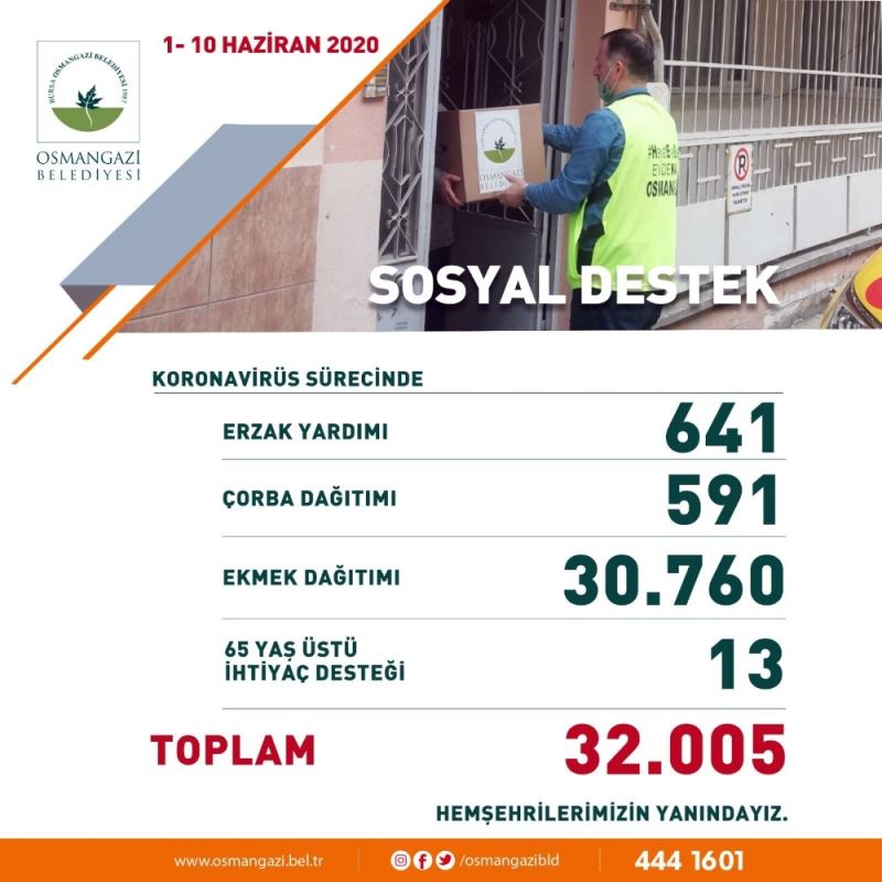 Osmangazi Belediyesi Vefa Sosyal Destek Grubu, sosyal destek çalışmaları kapsamında 10 günde toplam 32 bin 005 erzak, sıcak yemek ve ekmek dağıttı. Koronavirüs salgınının Türkiye’de ilk görüldüğü 11 Mart tarihinden itibaren yoğun mesai harcayan ekipler, her gün kapı kapı gezerek vatandaşların temel ihtiyaçlarını karşılıyor. Vatandaşların taleplerine anında cevap veren belediye ekipleri, 1-10 Haziran tarihleri arasında 641 erzak, 591 çorba, 30 bin 760 ekmek dağıtımı yaparken, 65 yaş üstü 13 vatandaşa da alışveriş yardımında bulundu. Son 10 günde toplam 32 bin 005 sosyal destek çalışması gerçekleştiren Osmangazi Belediyesi ekipleri, vatandaşların mağdur olmaması için gayret gösteriyor.