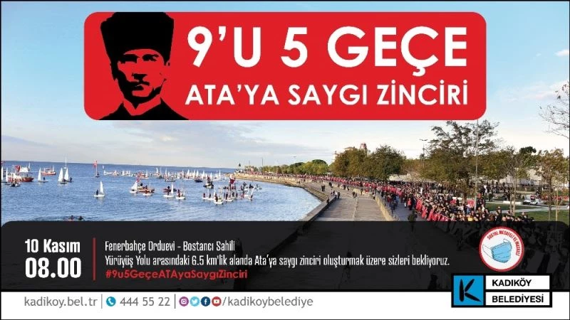 Kadıköy’de saat 9’u 5 geçe Fenerbahçe Orduevi ile Bostancı sahil arasında her yıl düzenlenen “Ata’ya Saygı Zinciri” pandemi önlemleri çerçevesinde bu yıl sosyal mesafeli olarak düzenlenecek. El ele tutuşmadan sosyal mesafe kurallarına uygun olarak planlanacak 6,5 kilometre uzunluğundaki zincire vatandaşlar aralarında 2 metre mesafe bırakarak katılım sağlayacaklar. Cumhuriyet’in kurucusu Ulu Önder Mustafa Kemal Atatürk’ün ebediyete intikalinin 82’inci yılında Ata’yı anma kapsamında düzenlenen Ata’ya Saygı Zinciri için sabah 8 itibariyle Fenerbahçe Orduevi ile Bostancı sahil arasında sosyal mesafe kurallarına uygun olarak toplanma başlayacak. 2013 yılından bu yana Kadıköy Belediyesi ve Kadıköy Belediyesi Gönüllüleri tarafından düzenlenen ‘Ata’ya Saygı Zinciri’ne denizden de kanolar, su jetleri ve tekneler 9’u 5 geçe sirenlerini çalarak katılacak. Dalgıçlar da denizin altında Atatürk posteri ve Türk bayrağı açacak. İzmir’deki depremde enkaz altındakileri kurtarma çalışmalarına katılan Kadıköy Belediyesi Kentsel Arama Kurtarma Takımı-BAK Kadıköy de Ata’ya Saygı Zinciri’nde yer alarak, Türk bayrağı açacak.