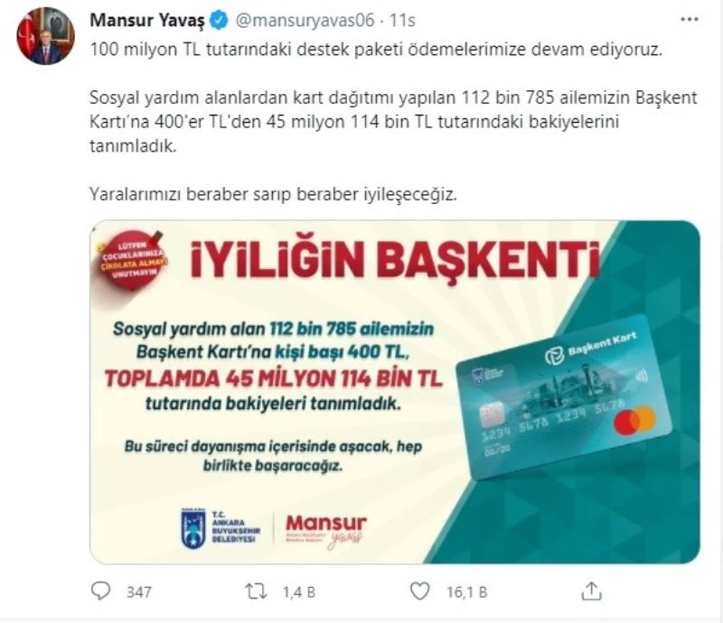 Yavaş, sosyal yardım alan aileler ile bu dönemde işini kaybeden esnaf ve sektör çalışanlarının yer aldığı toplam 232 bin 351 aileye 100 milyon TL’lik destek paketi hazırladıklarını kamuoyu ile paylaştıktan kısa bir süre sonra ödemelere başladıklarını sosyal medya hesapları üzerinden duyurdu. Yavaş, “100 milyon TL tutarındaki destek paketi ödemelerimize devam ediyoruz. Sosyal yardım alanlardan kart dağıtımı yapılan 112 bin 785 ailemizin Başkent Kartı’na 400’er TL’den 45 milyon 114 bin TL tutarındaki bakiyelerini tanımladık. Yaralarımızı beraber sarıp beraber iyileşeceğiz” dedi.