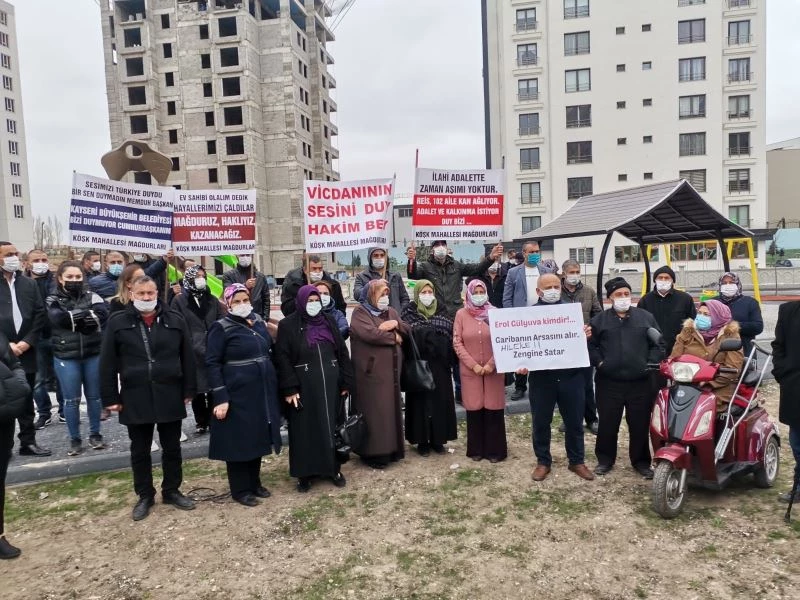 Kayseri’nin Melikgazi İlçesi’nde 102 arsa sahibi yaptıkları basın açıklamasında, 2005 yılında ev sahibi olmak ümidiyle arsalarını müteahhitlere verdiklerini ancak aradan geçen 16 seneye rağmen evlerini alamadıklarını söyledi.