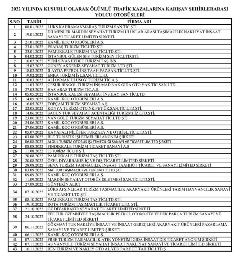 Emniyet Genel Müdürlüğü tarafından "kusurlu olarak ölümlü trafik kazalarına karışan şehirlerarası yolcu otobüsleri"ne ilişkin yapılan açıklamada, 1 Ocak-27 Kasım 2022 tarihleri arasında meydana gelen şehirlerarası tarifeli ve tarifesiz yolcu taşımacılığı yapan otobüslerin kusurlu olarak karışmış olduğu 43 ölümlü trafik kazasında olay yerinde 83 can kaybı meydana geldiği belirtildi. Açıklamada, ölümlü trafik kazalarına 36 farklı otobüs firmasının karıştığının tespit edildiği ve ilk sırada 6 ölümlü ve 18 yaralanmalı trafik kazasıyla Kamil Koç Otobüsleri AŞ firmasının yer aldığı vurgulandı. Açıklamada, yolcu taşımacılığı yapan otobüslerin trafik kolluğunca hem terminal çıkışı öncesi hem de karayolu üzerinde denetime tabi tutulduğu belirtilerek, sürücülerin hız, çalışma/dinlenme süreleri ile seyir halinde cep telefonu kullanımı başta olmak üzere trafik güvenliğine uymaları, yolcuların da seyahat süresince emniyet kemeri takmaları konusunda bilgilendirildiğine dikkat çekilerek şöyle denildi: