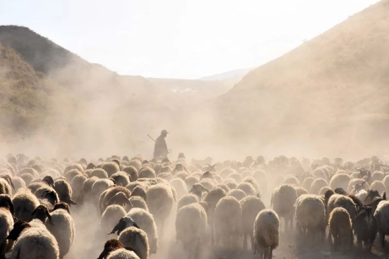 Nemrut Dağı eteklerindeki yaylalara hayvanlarını çıkaran köylüler, bu tozlu yolculuğu her gün gerçekleştiriyorlar. 15 kilometrelik yolu tamamlayan hayvanlar Van Gölü kıyısına gelerek susuzluklarını giderip sağımı bekliyor.