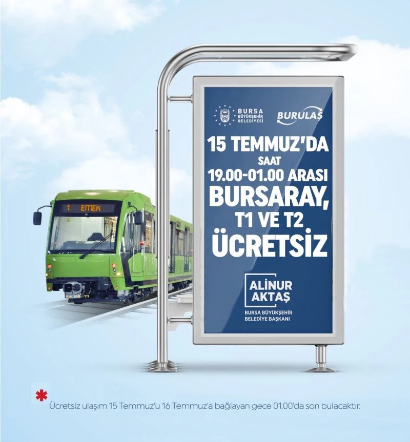 "15 Temmuz Demokrasi ve Millî Birlik Günü’nde Bursaray, T1 ve T2 Hatlarımız 19.00 - 01.00 saatleri arasında ücretsiz! Tüm hemşehrilerimi 15 Temmuz Demokrasi Meydanı’na bekliyorum."