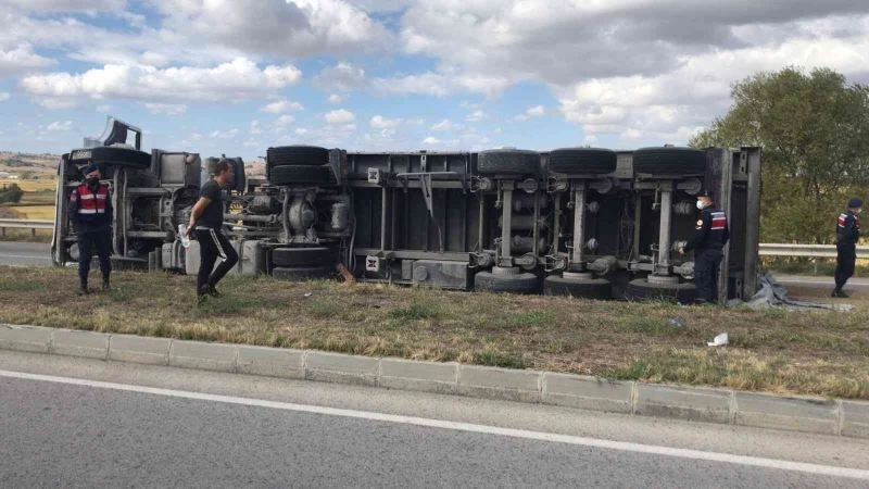 Edirne’nin Uzunköprü ilçesinde kontrolden çıkan ayçiçeği küspesi yüklü tır, keskin virajda direksiyon hakimiyetinin kaybedilmesi sonucu yan yatarak yaklaşık 150 metre sürüklenirken, sürücü kazadan burnu bile kanamadan kurtuldu.