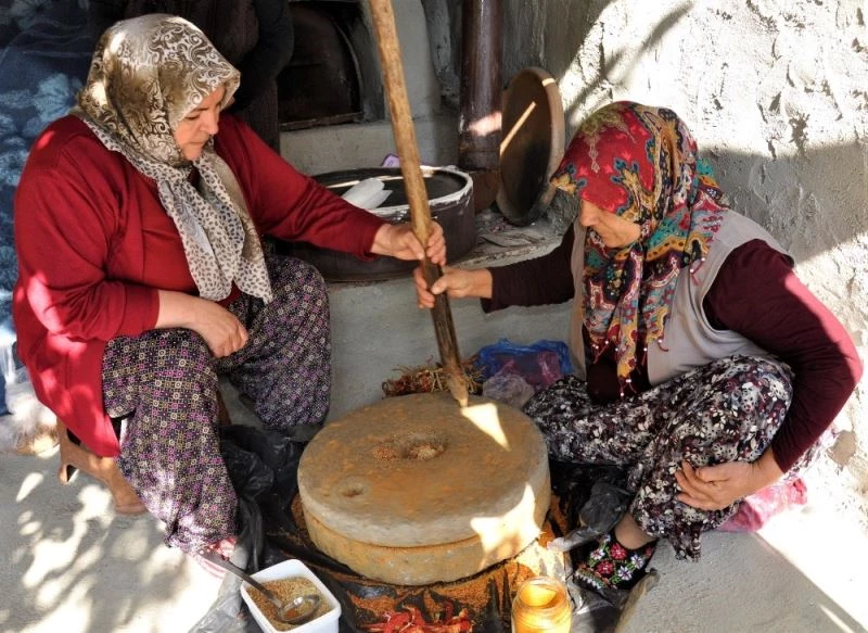 Frig Vadisi’nde tarihle iç içe yaşayan Şaziye Akduman ve Hatice Çabuk, dedelerinden kalma 150 yıllık taş değirmeninde muhacir kaya biberi öğütüyor.
