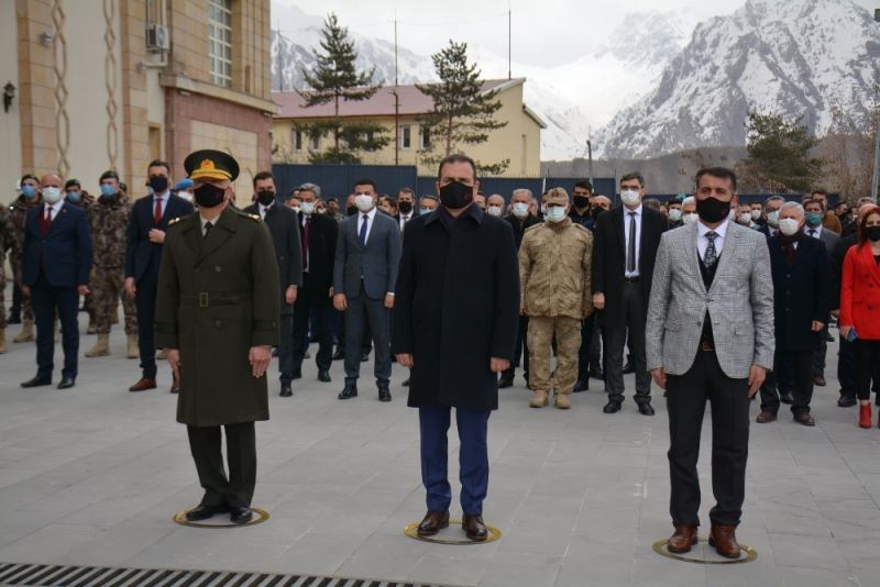 Hakkari Valiliği önünde düzenlenen törende ilk olarak valilik, belediye ve şehit ile gazi aileleri derneği tarafından çelenk sunumu gerçekleştirildi. Törene Hakkari Valisi ve Belediye Başkan Vekili İdris Akbıyık, Vali Yardımcısı Aziz Gölbaşı, Dağ ve Komando Tugay Komutanı Albay Hasan Paçalı, İl Jandarma Komutanı Tuğgeneral Ahmet Kavukçu, Cumhuriyet Başsavcısı İsmet Çınar, Hakkari Üniversitesi Rektörü Prof. Dr. Ömer Pakiş, İl Emniyet Müdürü Atanur Aydın, AK Parti İl Başkanı Abdulmuttalip Özbek, İl Milli Eğitim Müdürü Bilal Gür, sivil toplum örgütü ve siyasi parti temsilcileri ile vatandaşlar katıldı. Törenin ardından protokol üyeleri Atatürk Kültür Merkezinde Gazi Mustafa Kemal Anadolu Lisesinin hazırladığı programa katıldı. Saygı duruşuna durulması ve İstiklal Marşı’nın okuması ile başlayan program, günün anlam ve önemi üzerine konuşma, sine vizyon gösterimi ve tiyatro oyunu ile devam etti.